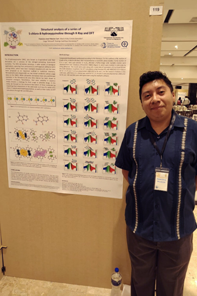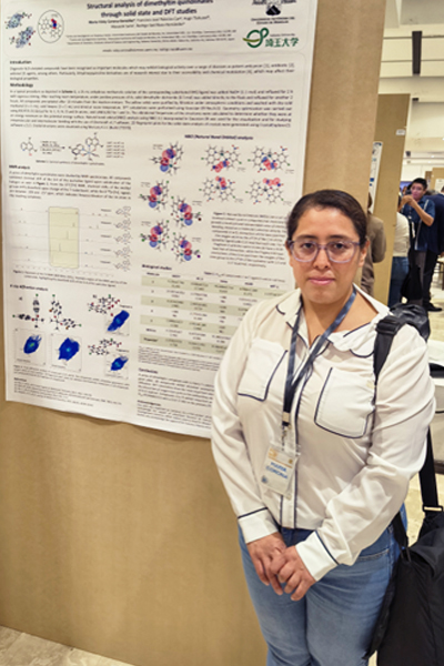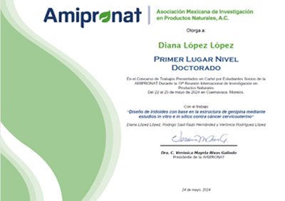 Primer lugar a nivel Doctorado en el concurso de Trabajos Presentados en modalidad de póster por Estudiantes Socios de la AMIPRONAT durante la “19a. Reunión Internacional de Investigación en Productos Naturales”, del 22 al 25 de mayo de 2024 en Cuernavaca, Morelos, con el trabajo: “Diseño de iridoides con base en la estructura de genipina mediante estudios in vitroe in silicocontra cáncer cervicouterino”.
