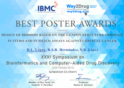 Premio al mejor póster con el trabajo: “Designofiridoidsbasedonthegenipinstructurethroughin vitro and in silicoassaysagainst cervical cancer”, en el “XXI Symposium on Bioinformatics and Computer-Aided Drug Discovery”, realizado del 20-22 de Octubre del 2025.
