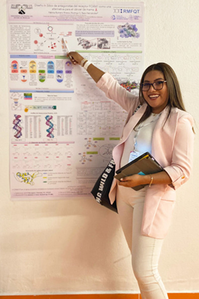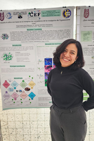 Actualmente realizo la tesis de licenciatura en el Laboratorio de Quimioinformática y Diseño de Fármacos, mi investigación está enfocada en la búsqueda y optimización de inhibidores antiparasitarios de la cruzipaína en Trypanosomacruzi. Mis intereses se centran en el diseño in silico con base en el receptor empleando herramientas computacionales, tal como el acoplamiento molecular.