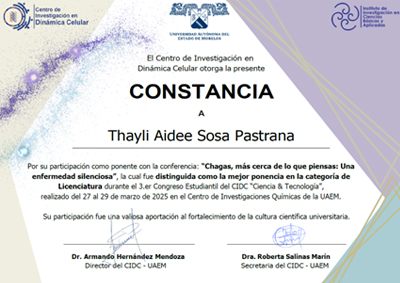 Mejor ponencia en la categoría de Licenciatura durante el 3er. Congreso Estudiantil del CIDC “Ciencia & Tecnología”, realizado del 27-29 de marzo de 2025 en el Centro de Investigaciones Químicas de la UAEM, con la conferencia “Chagas, más cerca de lo que piensas: Una enfermedad silenciosa”.